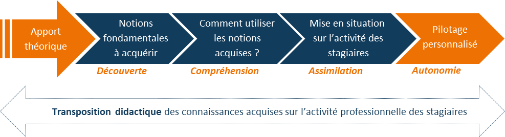 Ce mode d'apprentissage est rendu possible grâce à une méthode pédagogique adaptée, aux moyens pédagogiques mis en place et au déploiement d’un concept efficace basé sur la notion de transposition didactique.